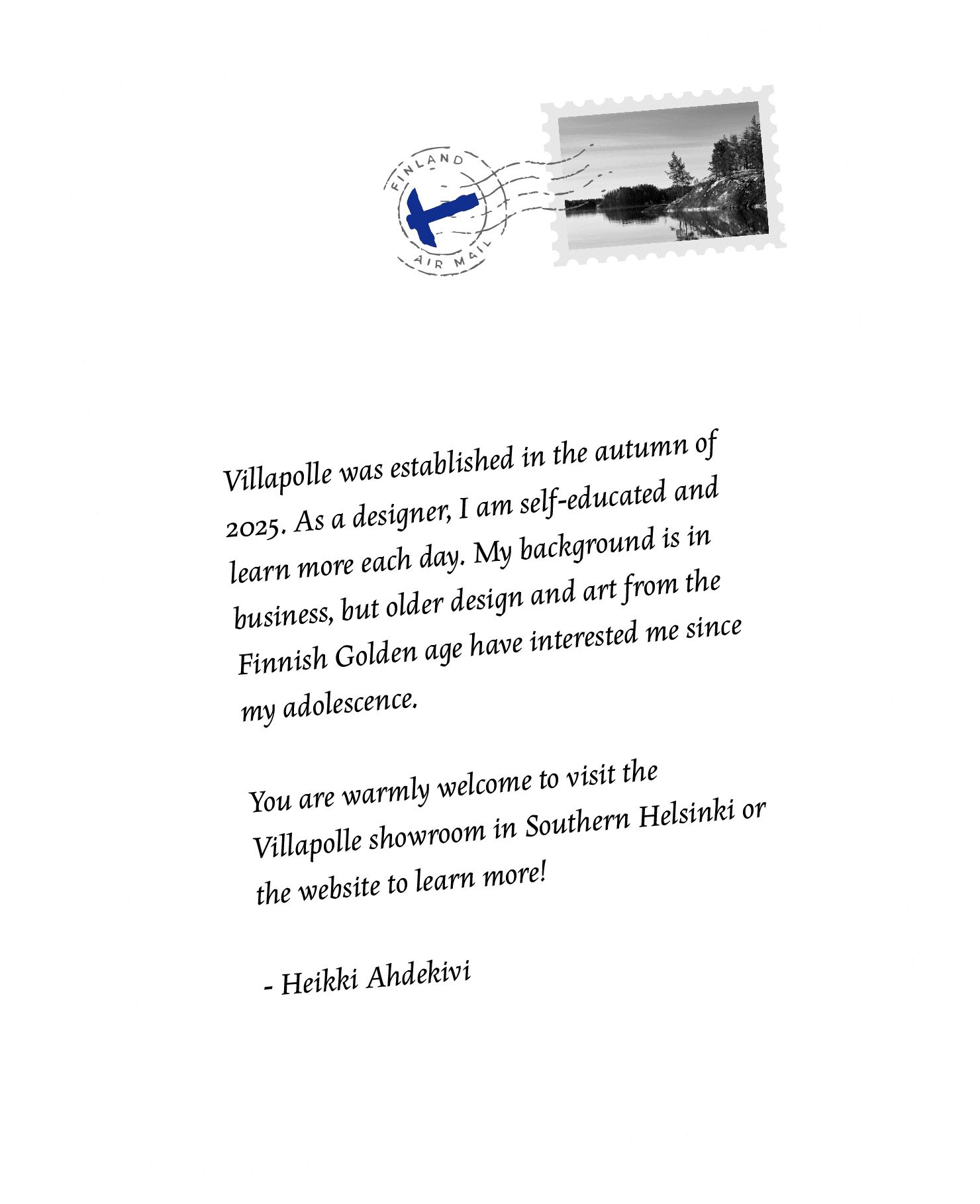 Customers in Finland are kindly requested to place their orders at the showroom. In case you are living outside Finland, please contact by email (info@villapolle.fi) or by phone (+358503706746). For the moment we ship only to Europe.